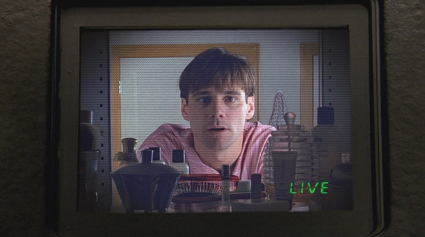 With the interviews running in the background, we also see the live montage of Truman’s morning routine. The first shot of Truman is him talking to his reflection/hidden camera in an escapist scenario, ironically reinforcing the idea that every human being seeks mental escape from reality, whatever the reality may be. However, rather than imagining something optimistic as most of us would, what he says is rather disturbing and contrasts with the serene and upbeat mood of the cast interviews. He imagines himself as part of a mountain climbing expedition, where he has to sacrifice himself as an “alternative source of food” in order to save another person. Not only does this bizarre scene set the tone for the uncanny, normal-but-not-quite atmosphere of the film, it also brings to the forefront a strong association with consumerism and the inability to separate a human from a product in a highly consumerist society.