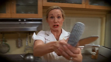 Slogans are an important part of the world created for the show and they carry a lot of additional, subtle meaning that submerges us into the film’s intended atmosphere. I would like to look into one such slogan that actually contributes to the major shift of the plotline from homely and comfortable to alienating and unsettling. For this, I would like to contrast two scenes. The first scene opens with Meryl in her nurse attire, white dress and a nurse cap, arriving home on her bike. This attire is supposed to create a soft, healing association which combined with her housewife persona culminates in an image of a traditional woman, innocent, defenceless and completely devoted to her family. After she greets Truman, she immediately starts talking about the new product she bought, which is a “Dicer, Grater, Peeler – all in one!” As soon as she starts advertising it, talking about it in an agitated way, the camera shows the close up of her holding the product with a bright smile on her face and then the close up of the product itself. It is undoubtedly strange, but because Truman does not really mind this behaviour we are not as taken aback by it either.