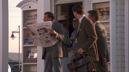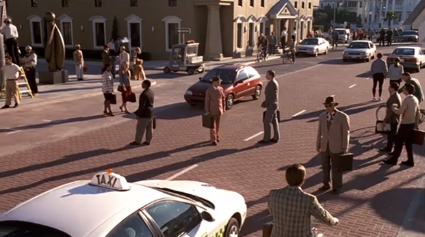 The film is also a great source of metonymy material (i.e. subliminal associations carried by certain objects) – in fact, it relies on those associations quite heavily. For example, one of the most consistent symbols is the yuppie fashion featured throughout the cast, both primary and the ensemble. Yuppie style, coming from the words “young upwardly mobile professional”, emerged in the 1980s; it became heavily associated with men and women who dressed smart and had stable jobs in the office. Most of the cast seem to belong to this class based on their fashion, which is why Truman’s “father” stood out as a homeless man. While the yuppie style was mostly associated with bigger cities, it is important to note that the Truman Show set has a very inconsistent stylistic timeline, in order to embody the vacuum-like state that it exists in. For example, Meryl’s style, as well as the home interior, is inspired heavily by the suburban 1950s, while the town’s architecture is described as “colonial” in one of the billboard ads, which dates to at least the 19th century. It is interesting that both the suburban 1950s and the “colonial” style are now associated with strict societal rules and oppression, despite the aesthetically appealing surface so that certainly reflects the phoney beauty of Seahaven.